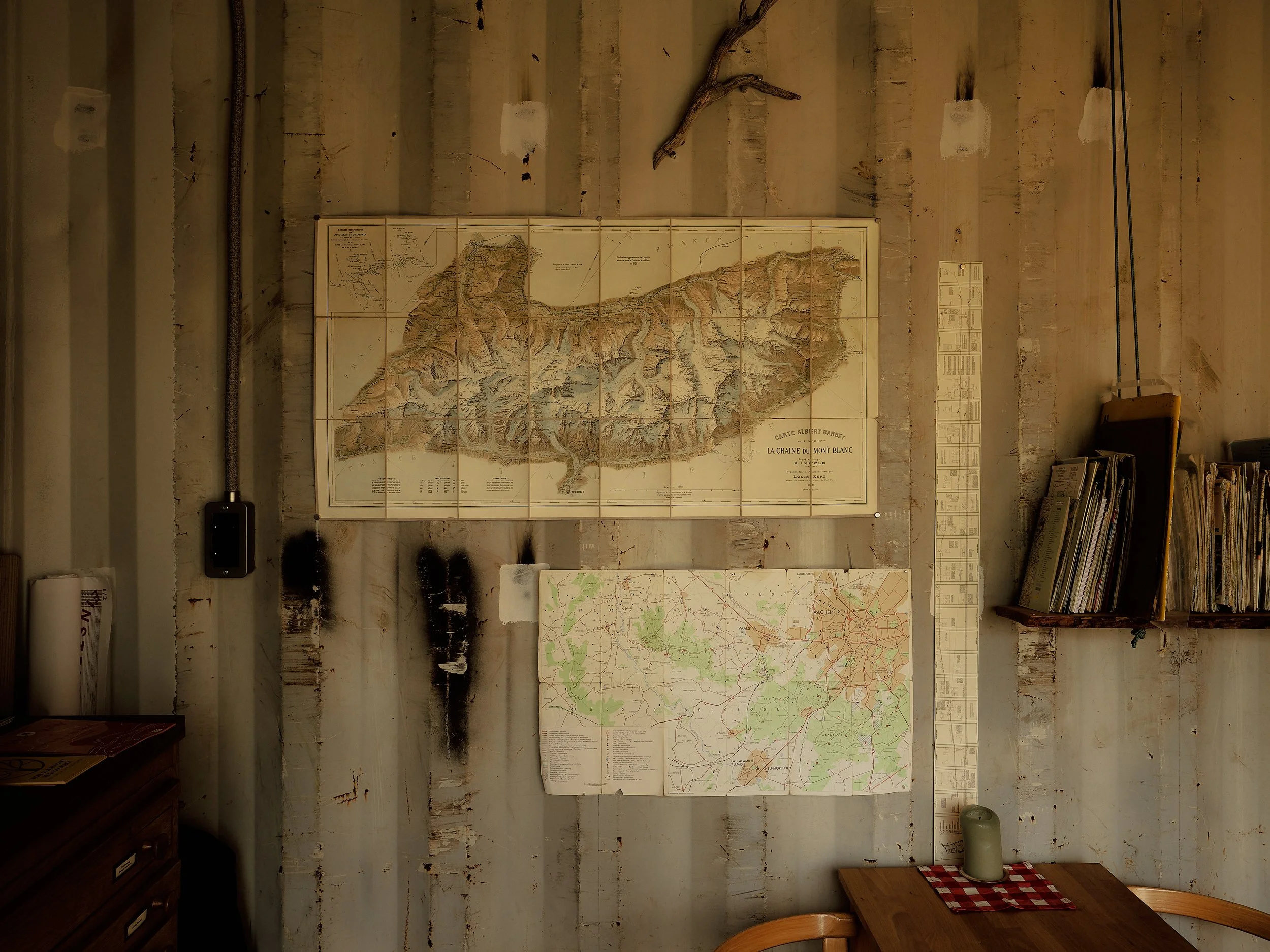 An einer der Stahlwände im Café hängt eine der vielen Karten im Institut, die Marlies besonders fasziniert. Die Karte zeigt das Gebirge rund um den Mont Blanc und ist aus Daten der drei umliegenden Länder Italien, Schweiz und Frankreich zusammengetragen.